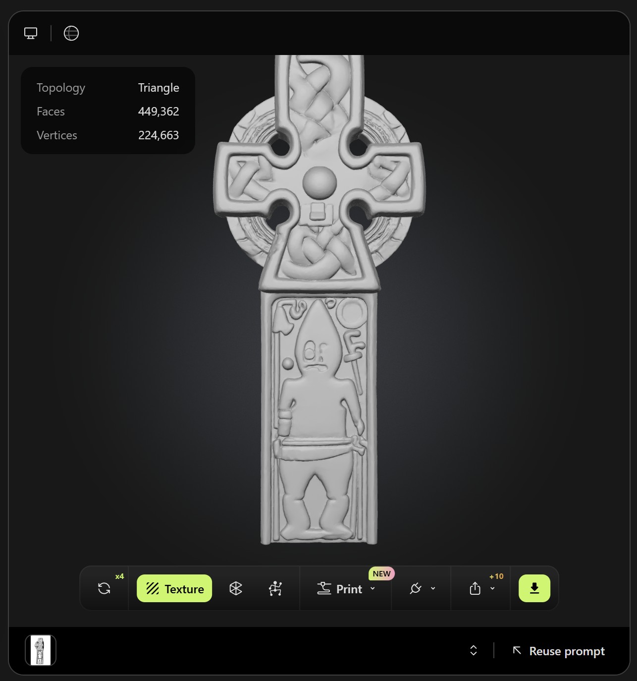 This example shows the limitations of Meshy.ai because it generated a strange interpretation of the markings on the cross, especially with the face of the human figure. Also, Meshy.ai decided to regenerate the part of the cross that no longer exists. Meshy.ai does allow for refining and giving instructions for new iterations of the generation, but you will not have full control over what the AI decides to create.