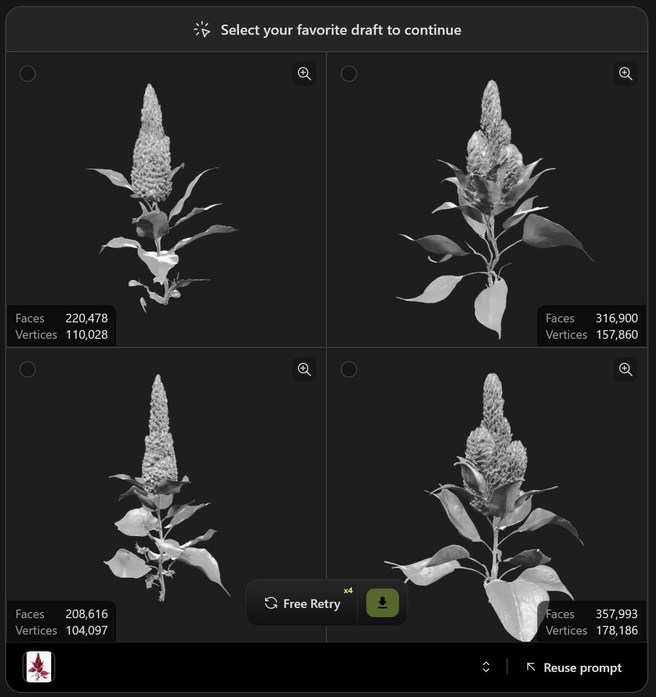 As an item to demonstrate the positive potential for using Meshy.ai we chose to generate a 3D Amaranth flower. We input the image on the left into Meshy.ai and got a satisfactory output. Meshy.ai provides you with four drafts and you choose the one you like best to download.