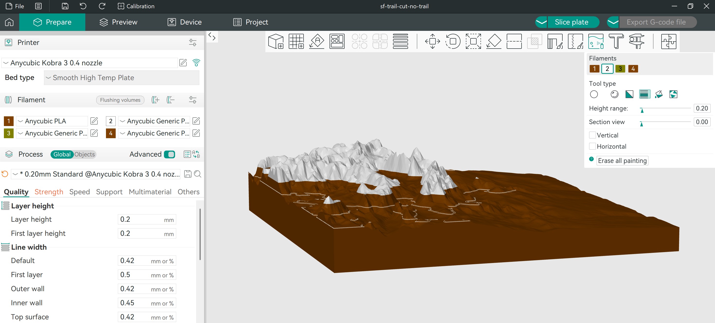There are many ways to print terrain. Many include gathering and assembling relevant datafiles and transforming them into an STL file that can be loaded into slicing software (like Orca) for a 3D printer. This can be a very complex process, but allows for high levels of control and precision.