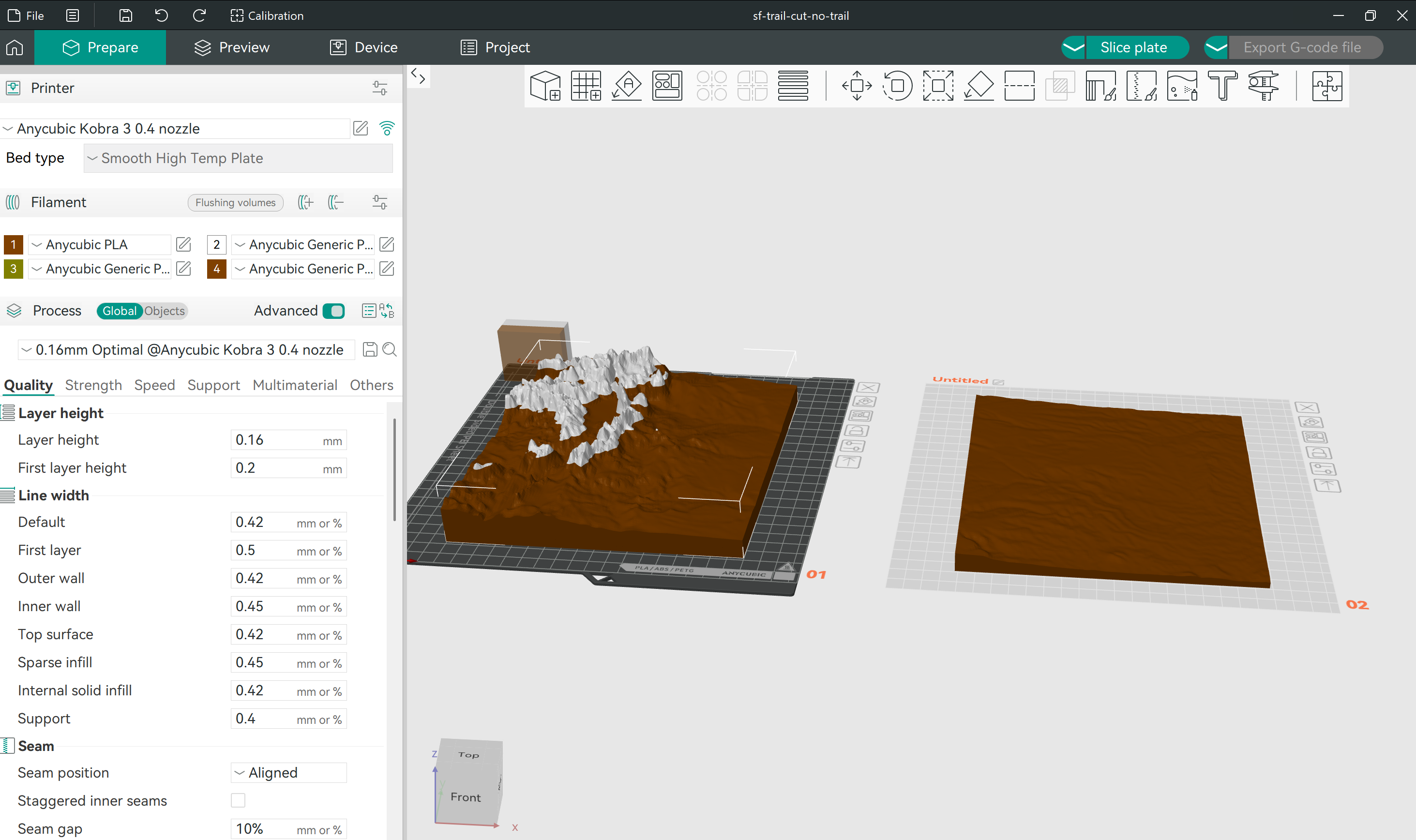 For this model of the Santa Fe Trail, we wanted to create something larger than the size of the build plate. First we selected a rectangular piece of terrain whose dimensions would add up to the length and width of two build plates on the printer.