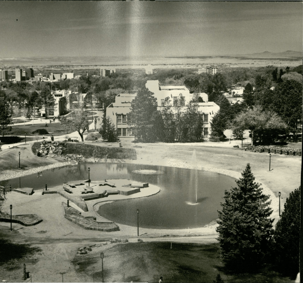 Original it was called the lake or University Pond, but early on students coined the name Duck Pond after it became an instant hit with the students in the fall of 1975. the Daily Lobo on the other hand referred to as a concrete lake, even thought there was no concrete used, but clay instead.the Daily Lobo also called it the No-Name pond, and criticized it constantly referring to it as the height of tackiness, obtrusive, and inappropriate. Professor Emeritus T. M. Pearce referred to it as the Pond of No Return, and suggested it should be bulldozed and returned to nature.