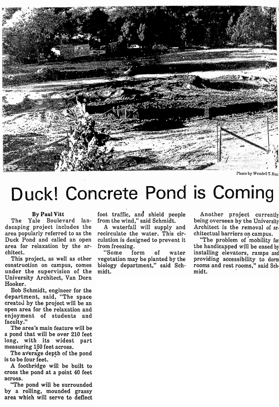 An article from the Daily Lobo published October 8, 1975 referring to the Duck Pond as the Concrete Pond.