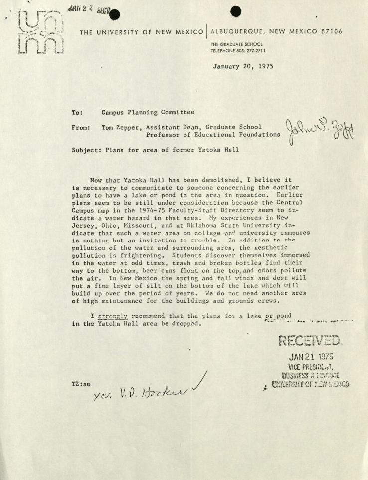 A letter of complaint against the pond sent to the Campus planning committee from Tom Zepper, Assistant Dean.