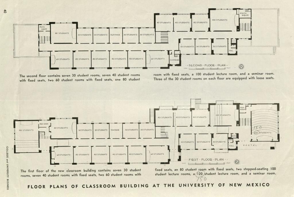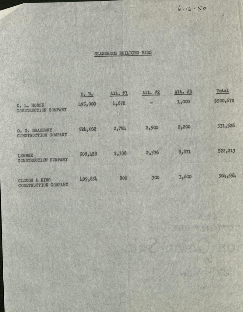 In May of 1950 the board of regents approved plans and specifications for the classroom buiding known as number 23. The building had two floors plus a partial basement and 40 classrooms ranging in size from 20-150 seats. Bids were taken at the State Purchasing office in Santa Fe NM, on June 12th, 1950. K.L. House Construction company was awarded the contract and started working on it June 19th.