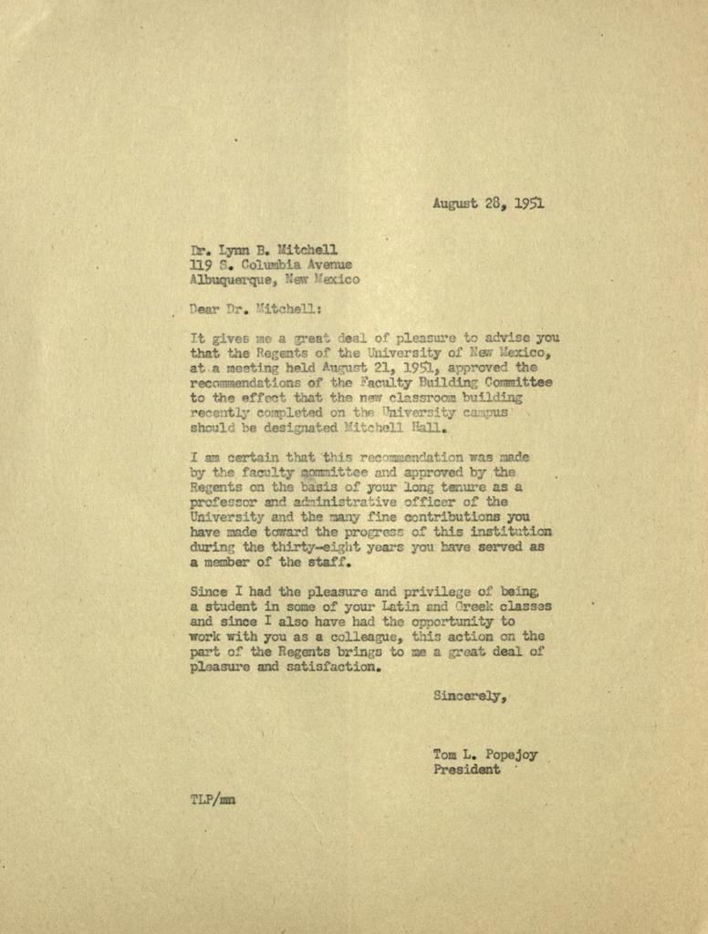 A letter from President Tom Popejoy to Dr. Mitchell stating that that the name of building #23 be named after Lynn B. Mitchell. It was approved by the board of regnets on August 21, 1951.