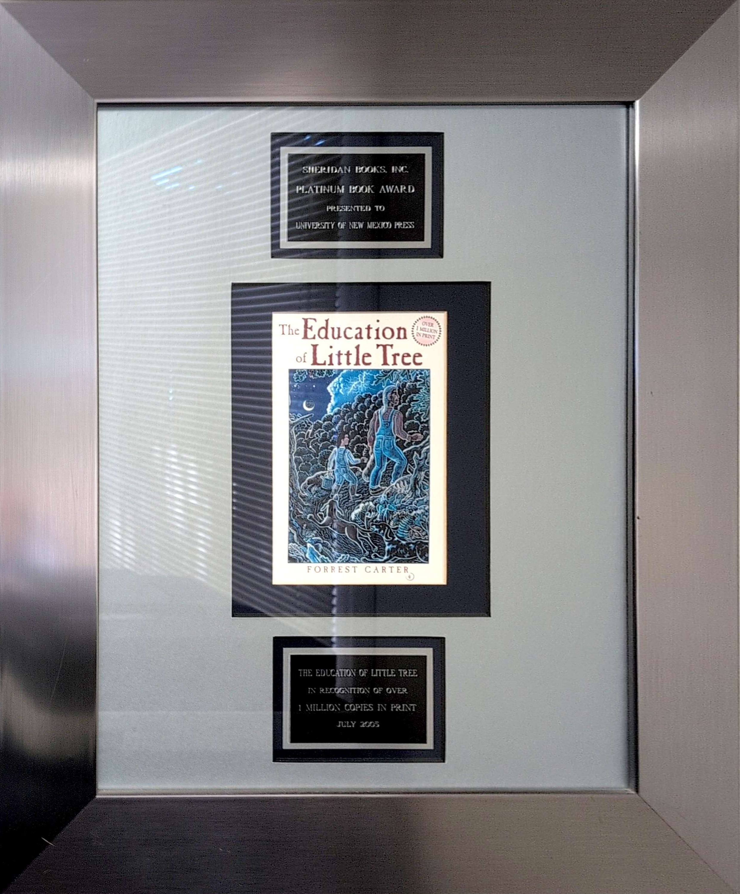 A plaque on display in the UNM Press lobby for the Sheridan Books, Inc. Platinum Book Award, commemorating the existence of over a million print copies of The Education of Little Tree as of July 2005.3