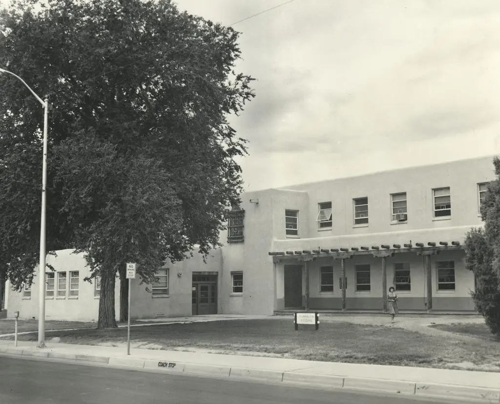 After that, one of the buildings was reappropriated as a music studio for a short time, before the Press ultimately ended up inhabiting both of them. At the time, the buildings were connected by an outdoor boardwalk. In 1934, the Buildings and Grounds Department was able to double the size of the Press by removing the shared walls between the two buildings and constructing a roof over them both. The resulting structure was joined to Carlisle Gym and still stands to this day; the United States government’s Works Progress Administration helped make the renovation possible.13 It was further expanded in 1938, when Professor William E. Burk of the School of Architecture donated his services to once again double the space within the building while also giving it a makeover in the Pueblo Revival architectural style. The Press occupied the building until 1949. The former Korber Radio Station buildings would come to house the Office of Veterans’ Affairs and the Counseling and Testing Division, and remain standing to this day as a facilities management structure.