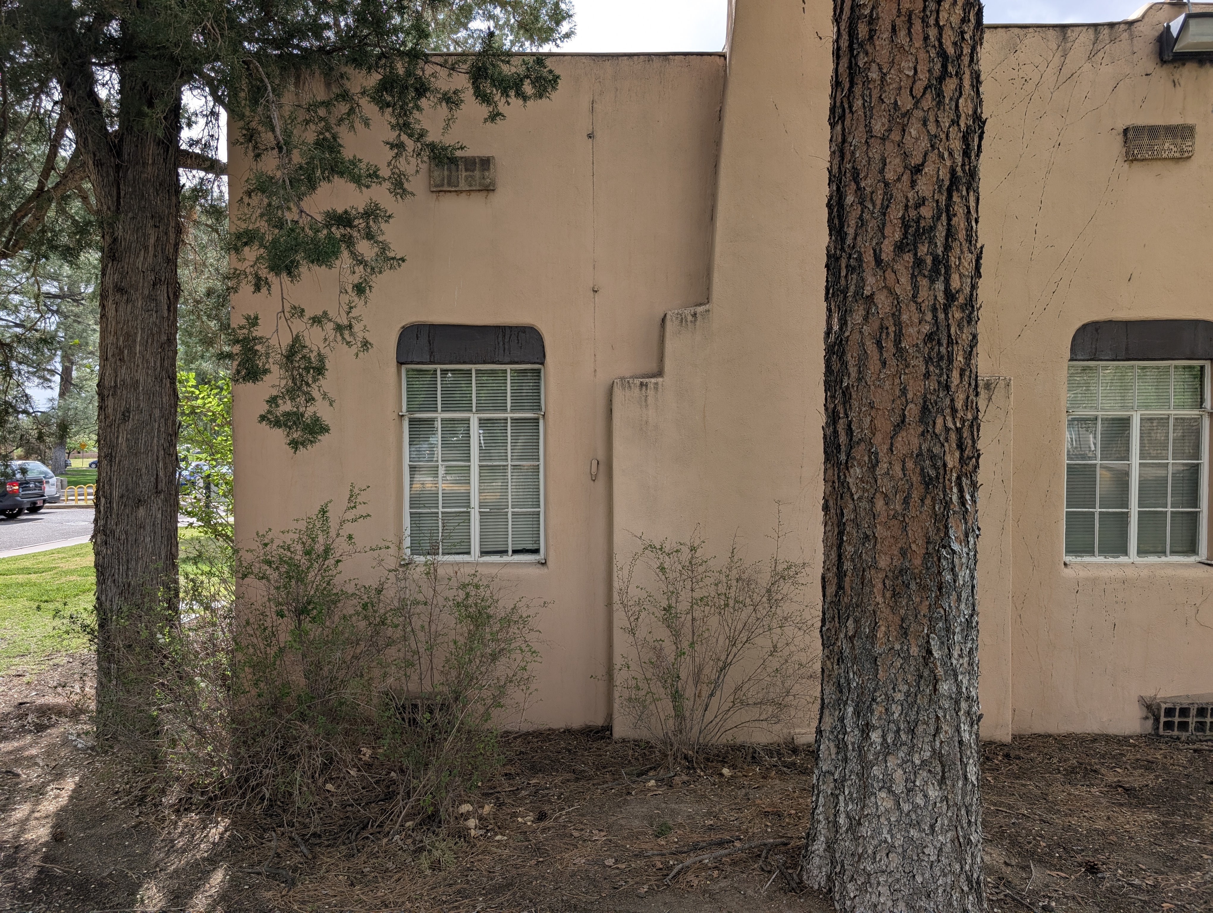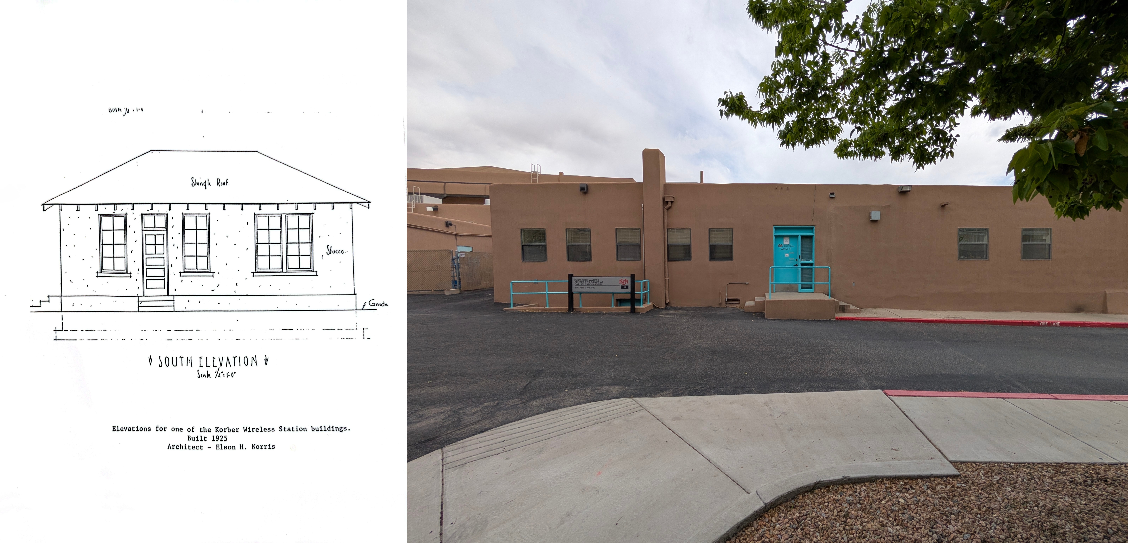 An architectural drawing of one of the original Korber Wireless Station buildings11 compared to the site today, now housing UNM Facilities Management.3 If one looks closely, they can see lines in the stucco to the right of the door that appear to match with where a window originally was, complete with it being taller than the door, and another seam level to the ground that seems to align with the originally raised entrance walkway. Accordingly, this is likely to be the same side of the building depicted in the drawing, particularly because there is no other doorway raised above the ground in this manner on any other side.