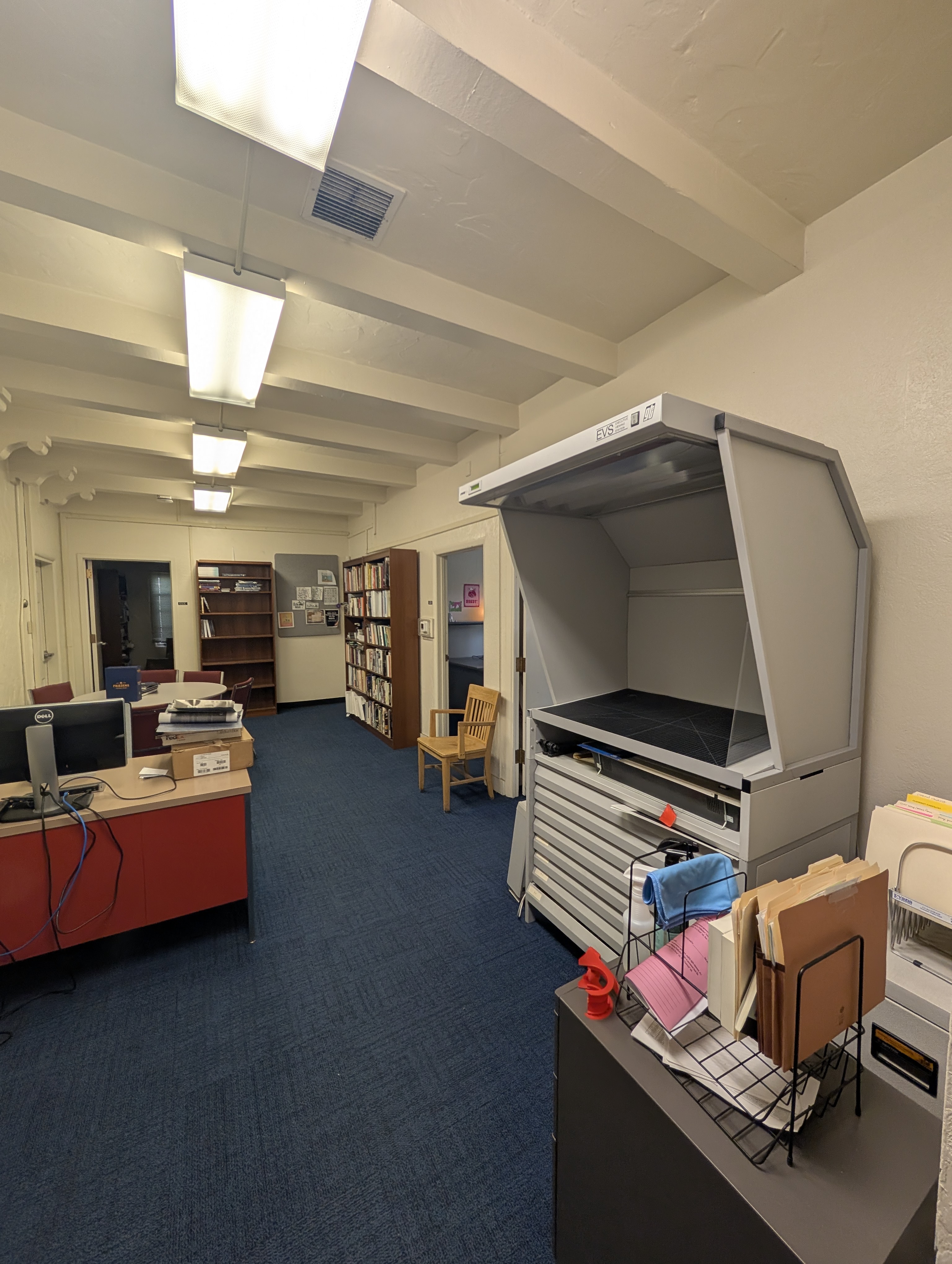 Perhaps where the building’s history shines through most clearly is in the Ernest R. Earick Memorial Library, though. Even in the adjacent hallway, a gap in the floor trim marks where a door once stood, leading to the matron’s room originally and the housemother’s reception room in Hesselden’s time. Even inside the room, though, there are distinctive signs left behind. A small divot in the ventilation jutting down from the ceiling, now propping up some New Mexico Quarterly magazines, marks where a closet once was. In the back-right corner, the ceiling opens up where another door once stood. A protrusion that links with the vent across the room is all that remains of a bathroom. It is quite appropriate that a building with such a storied history is now home to an organization focused predominantly on putting stories and histories out into the world.