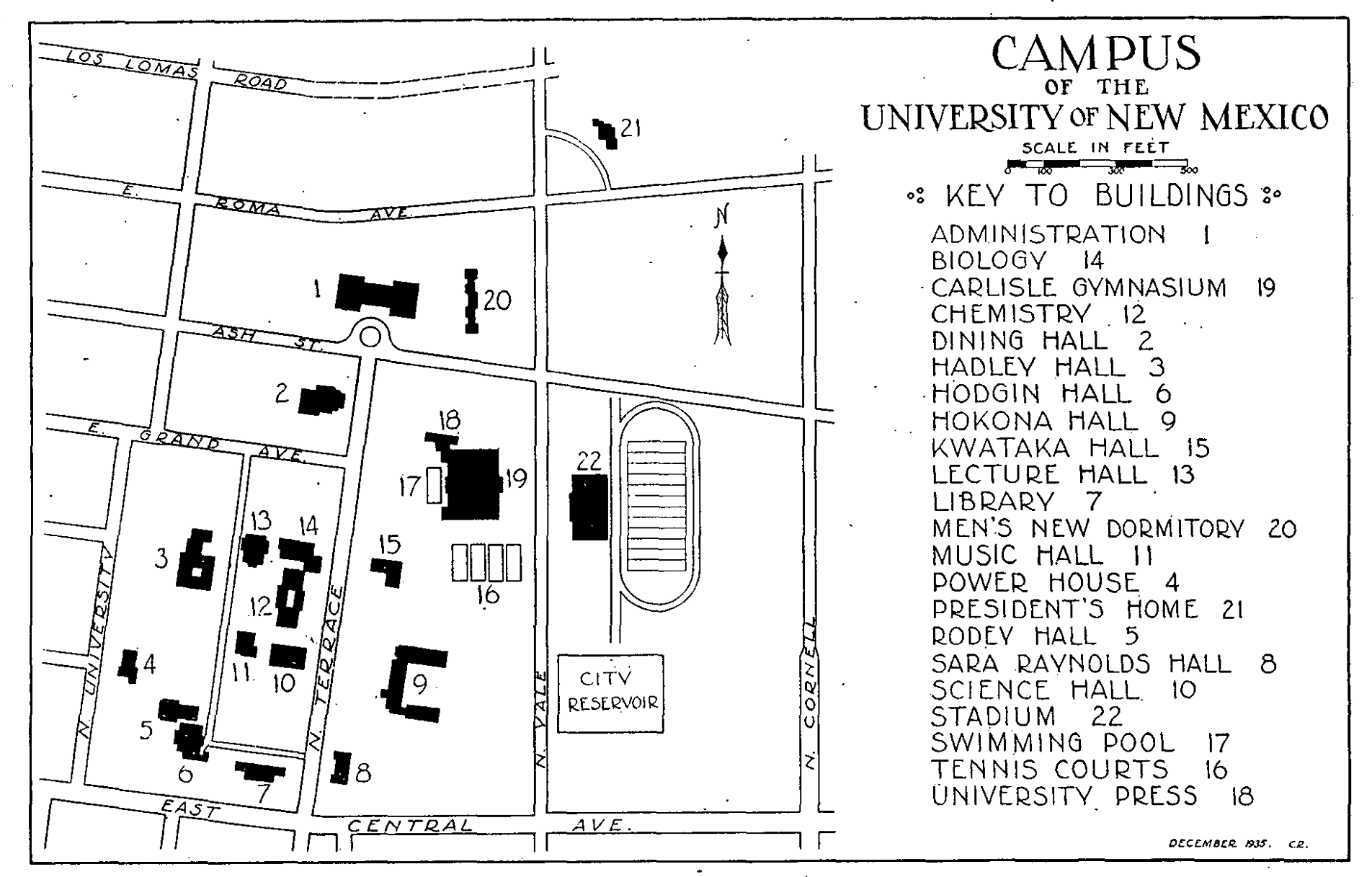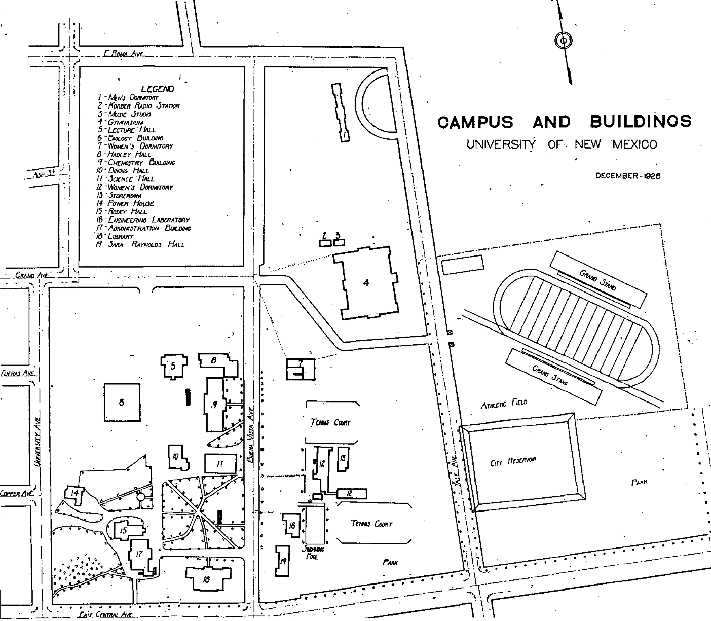 A map of the University of New Mexico campus in December 1928, showing the eventual home of the Press in its original state.11