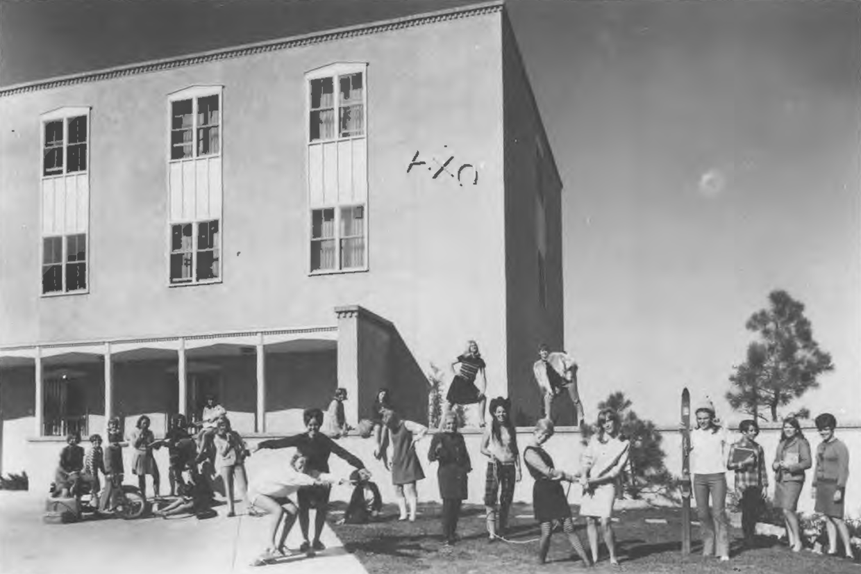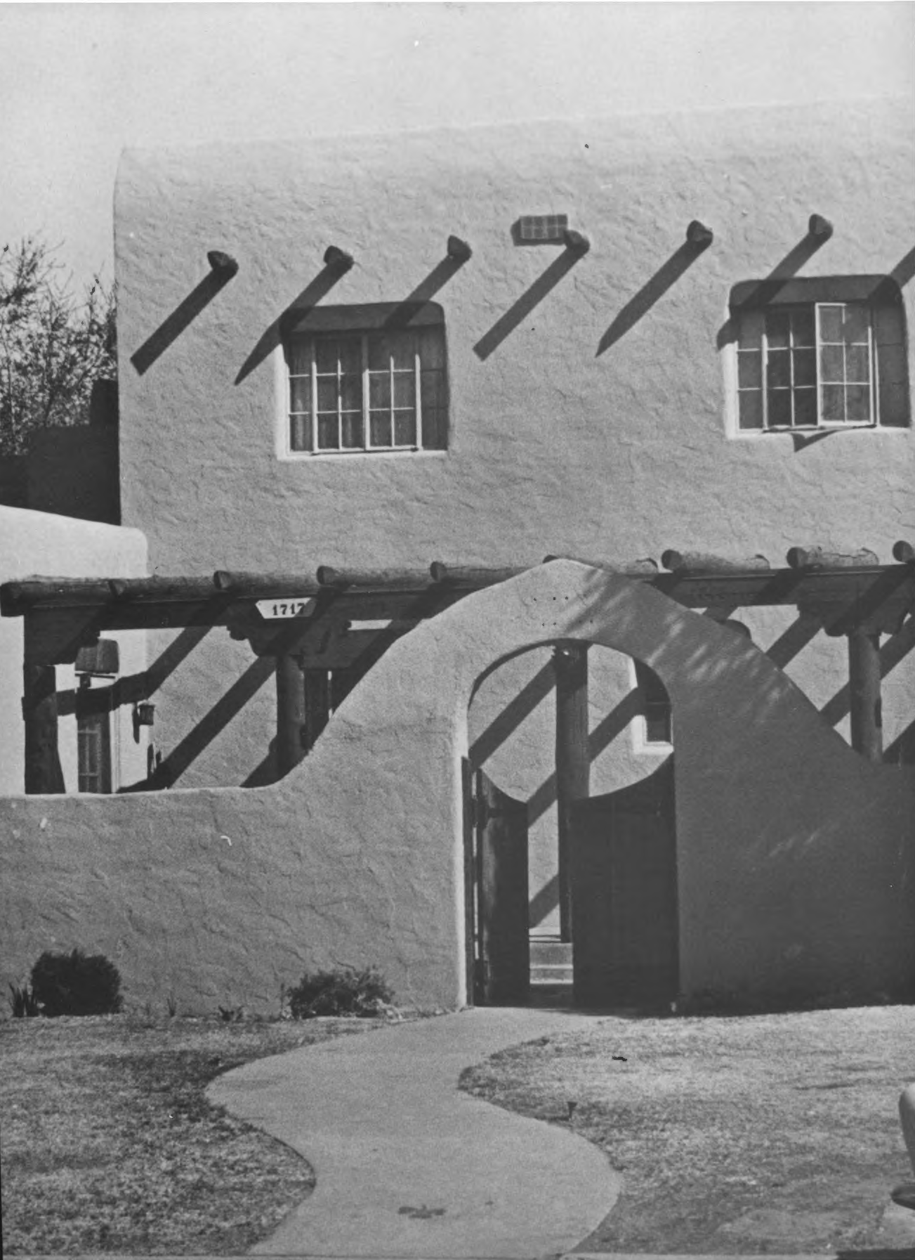1717 Roma Avenue NE went through a particularly radical shakeup in the 1960s. In October 1965, the Board of Educational Finance approved a University revenue bond issue to finance various endeavors, such as the construction of The Pit, an Olympic pool, the Laguna and DeVargas dormitories, and La Posada, the dining hall.24 Simultaneously, they approved UNM’s purchase of the Alpha Chi Omega fraternity house. The sorority had outgrown it, and they subsequently moved into a new, larger house designed in a Spanish colonial style.29