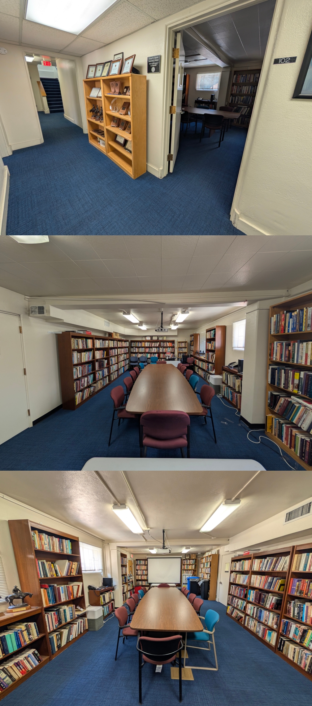 The hallway outside the Ernest R. Earick Memorial Library and the library itself from both sides.3 It houses the majority of the Press’s output and also acts as a conference room for Press meetings.