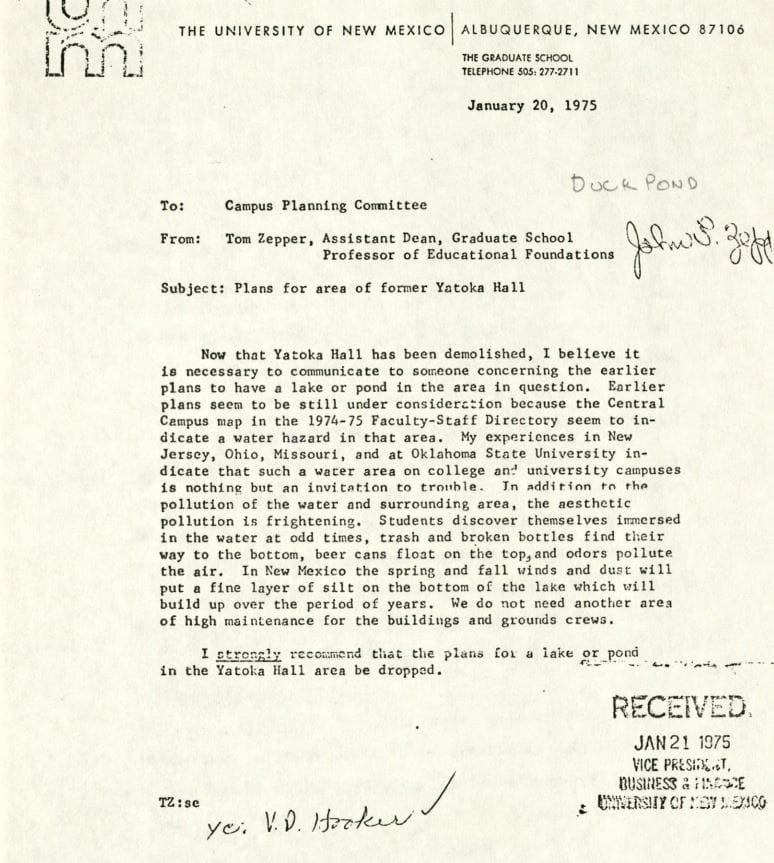 While Yatoka Hall seemed to serve a variety of purposes in it’s time at UNM, there had been discussions of demolishing the building to make room for a natural landscape. In January, 1975, demolition was complete, and the area was clear for a natural landscape to be built which would later be known as the Duck Pond. It is possible that administration easily decided to demolish Yatoka Hall because it required a lot of maintenence for a building that was only used for miscellaneous storage and classrooms. The building was renovated in the 50’s to fit the style of its surrounding buildings, however, Yatoka Hall was still only supplementary to this area serving a very limited purpose.