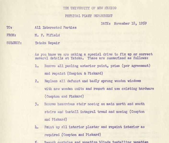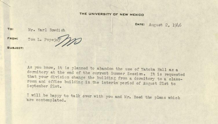 After years as a men’s dorm hall, Yatoka Hall would no longer serve as a dorm hall since even more dorms were built by 1946. By this same year, future UNM President, Tom Popejoy, recommended to the rest of the administration that the dorms should be converted into classrooms for the following years. Since then, the building served as classrooms for the College of Business Administration, psychology, art studios, and even a coffee shop known as Mrs. Blum’s Coffee Shop. As the years went on, Scholes Hall, Mitchell Hall, and Zimmerman Library would surround the area around Yatoka Hall.