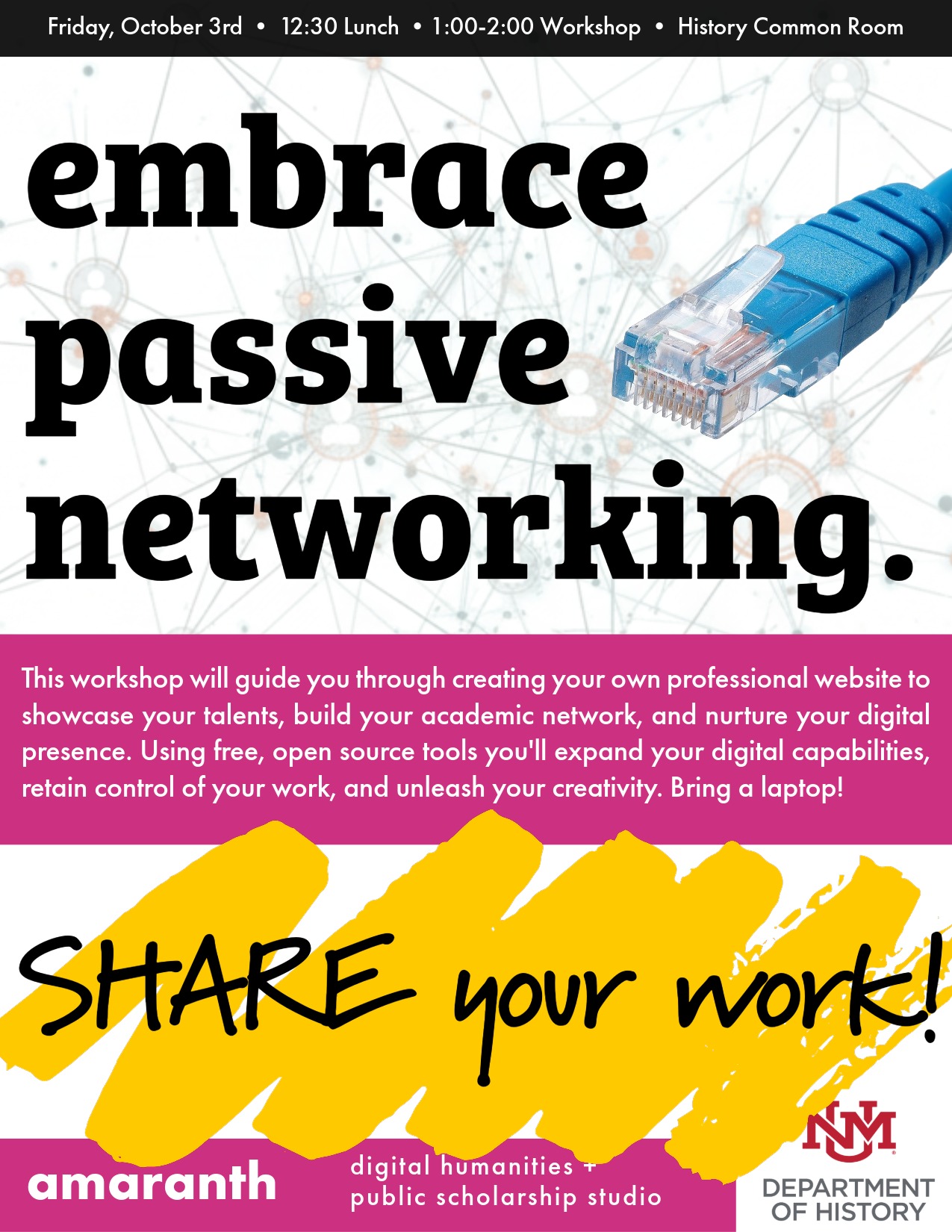Amaranth is parterning with HGSA to offer a poster contest for History Graduate Students. This semester, the required format is a conference poster. The deadline is November 7th and entries should be emailed to hgsa@unm.edu